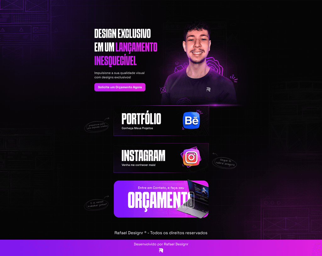 Sou o Rafael Silva, um apaixonado por design gráfico e web design há 3 anos. Decidi me especializar na área de web design há exatamente 1 ano, com foco em ajudar infoprodutores com seus negócios online, especialmente na criação de landing pages